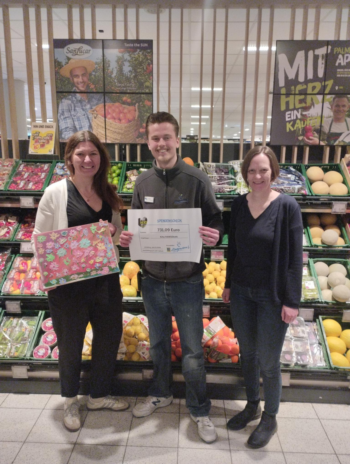 Viele Kundinnen und Kunden haben in den letzten Monaten ihre Pfandbons bei EDEKA-Bergmann im Loewe-Center für ein Unterstützungsprojekt der Kita HANSEkids gespendet. Jetzt konnten unsere Kolleginnen aus der Leitung im EDEKA-Markt einen ansehnlichen Spendenscheck in Höhe von 731,09€ entgegennehmen. Nun sollen Spielgeräte, Fahrzeuge und Sandspielzeug für den Außenbereich angeschafft werden.