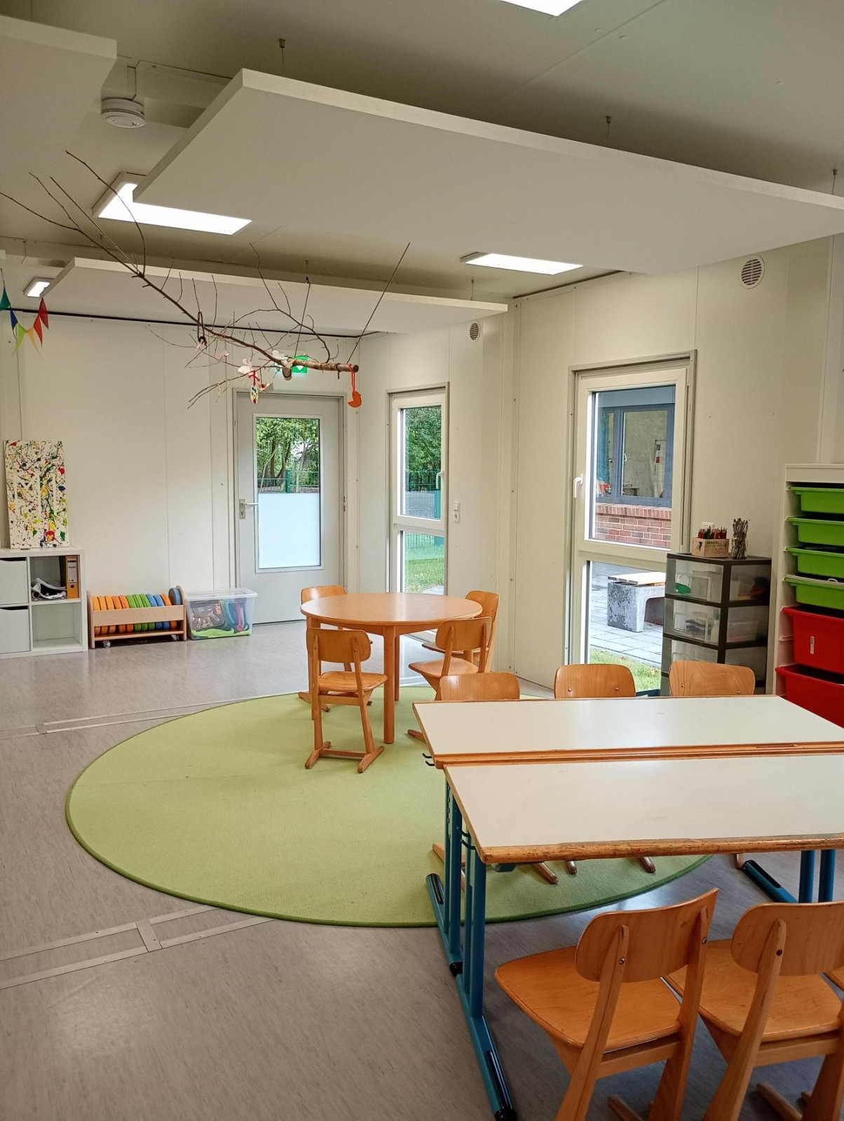 1 großzügiger Gruppenraum im Container, Mitbenutzung eines weiteren Containerraumes, Bibliothek, Küche+Nebenraum, sehr großer und ansprechender Schulhof, Turnhalle
